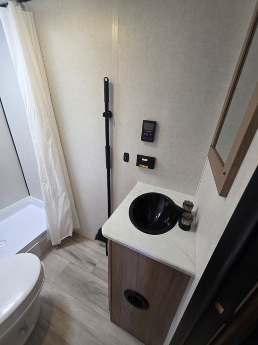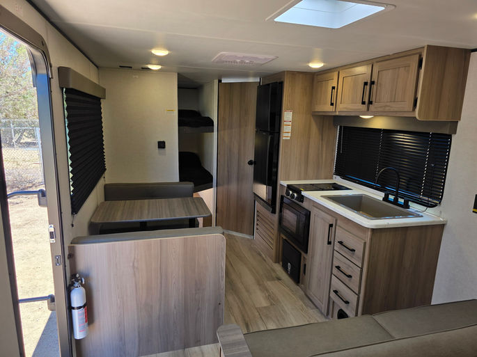 Light weight (5000 pounds) towable with a half truck or SUVs. Sleeps 8, potentially 10, with a queen bed in front, fold down sofa bed, two full bunk beds in back, and the dinette turns into a comfortable sleeping area. Equipped with a 24v 100ah lithium battery and 1200 watts of solar. This unit also has a 3000 watt inverter to power all of your 120v accessories. This trailer is equipped with a bright outdoor LED strip, an 42 gallon fresh water tank, and two 20 pound propane tanks to provide gas for the tankless water heater and keep the built in heater working so the trailer is toasty during the cold months.