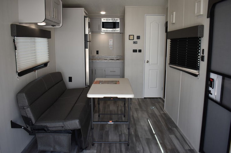 The only toyhauler that has a 184x78 inch garage that can accommodate a 4 seater 72 inches width side by side that can be towed with a HALF TON TRUCK! Only 22 feet long with side patio to hang out on, two queen rear bunk beds that go up and out of the way for a complete open floor plan. Large refrigerator/freezer, kitchen sink, and a two burner cooktop stove. 100 gallons of fresh water, 24v 200ah lithium battery with 2100 watts of solar on the roof and a 3000 watt inverter to run all of your 110 appliances including the microwave! Nice outside flood lights on all 3 sides to illuminate your camping spot. Unit has a toilet with a 36x24 shower pan with a 6 gallon gas water heater. Dual 20lbs propane tanks with a 20k BTU furnace to keep you warm while your dry camping in the desert and a nice 15k BTU air conditioner to keep you cool in the summer.